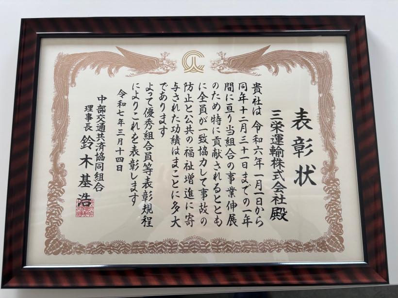 優秀組合員表彰 2025年04月09日(水) 中部交通共済協同組合様より「優秀組合員」として表彰されました。 本表彰は、安全運行や事故防止への継続的な取り組みが評価されたものであり、従業員一人ひとりの努力の結晶です。 今後も「安全第一」の理念のもと、信頼される運送会社として、地域社会への貢献と交通安全の実現に努めてまいります。